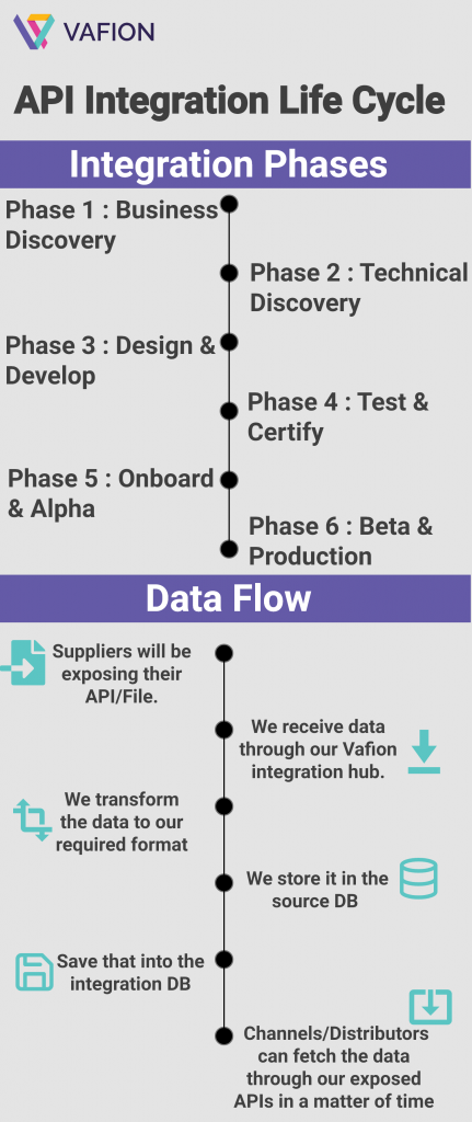 Different integration specialists have their own way of data integrations. Here we are speaking about how Vafion handles data during a supplier API integration. Suppliers will be exposing their API/File. We access the supplier platform and receive data from them through our (Vafion) integration hub. The data we receive through integration hub will be stored in the source DB (Mongo DB) without any sort of transformation on it. We transform the data received to our required format (Vafion) using CAMEL and Spring Batch. Spring Batch helps in executing batch jobs in the best way. Following which we save that into the integration DB. Channels/Distributors can fetch the data through our exposed APIs in a matter of time making integrations super fast.